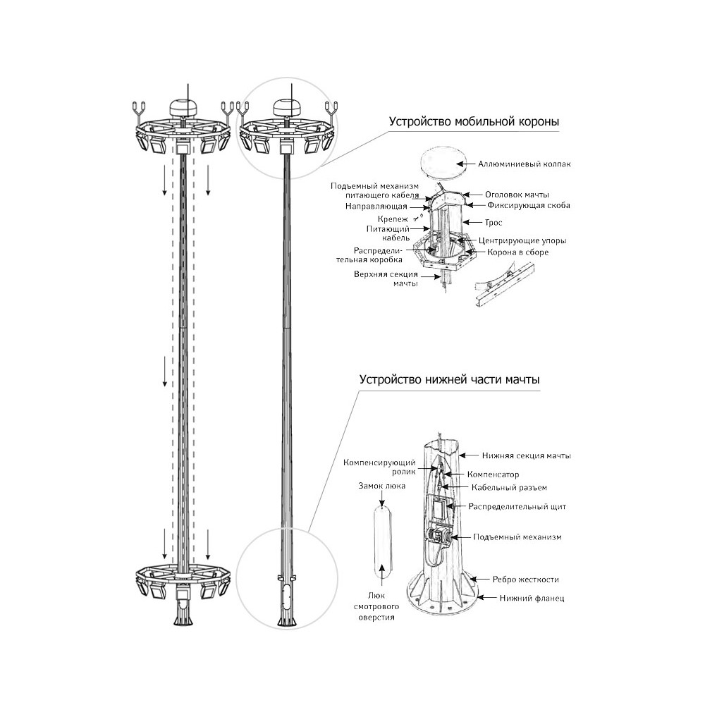 ВГМ-16 конструкции, выполняемые из листового проката с применением современных методов автоматической сварки, позволяющих получить максимально надежный сварной шов. При этом металлоконструкция имеет минимум точек напряжения, что позволяет ей сохранять вертикальное положение в различных условиях. Важным конструкционным элементом системы является мобильная корона, устройство которой позволяет отказаться от больших затрат на обслуживание сложных высокомачтовых опор и значительно расширить географию их применения.
